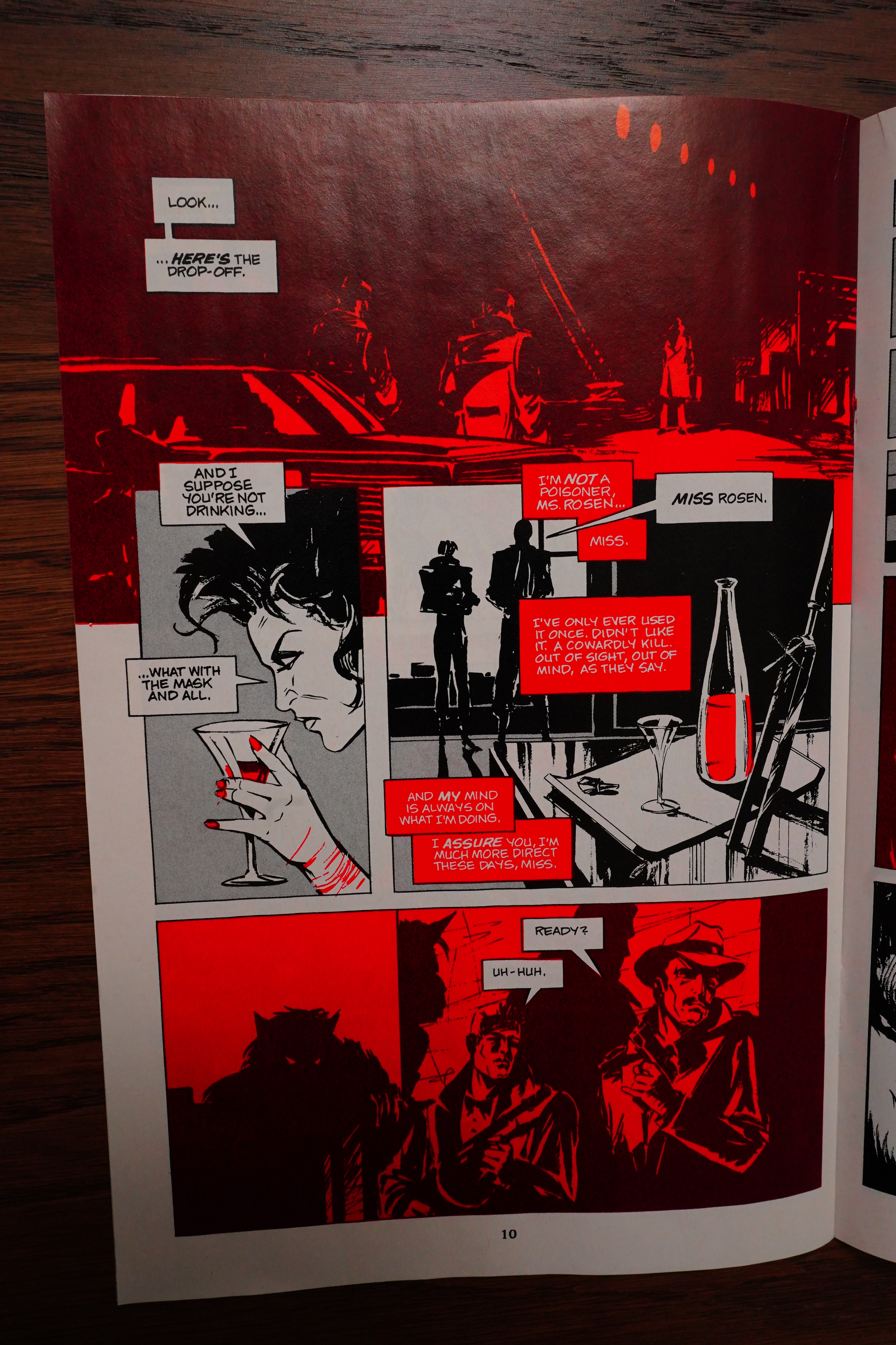 But he does the characters very well. There’s a distinct lack of backgrounds to many of the scenes, though. Which gives colourist Tom Vincent ample space to do his thing, which is to add flat and very saturated colours throughout. It’s pretty stark, but appealing, I think.