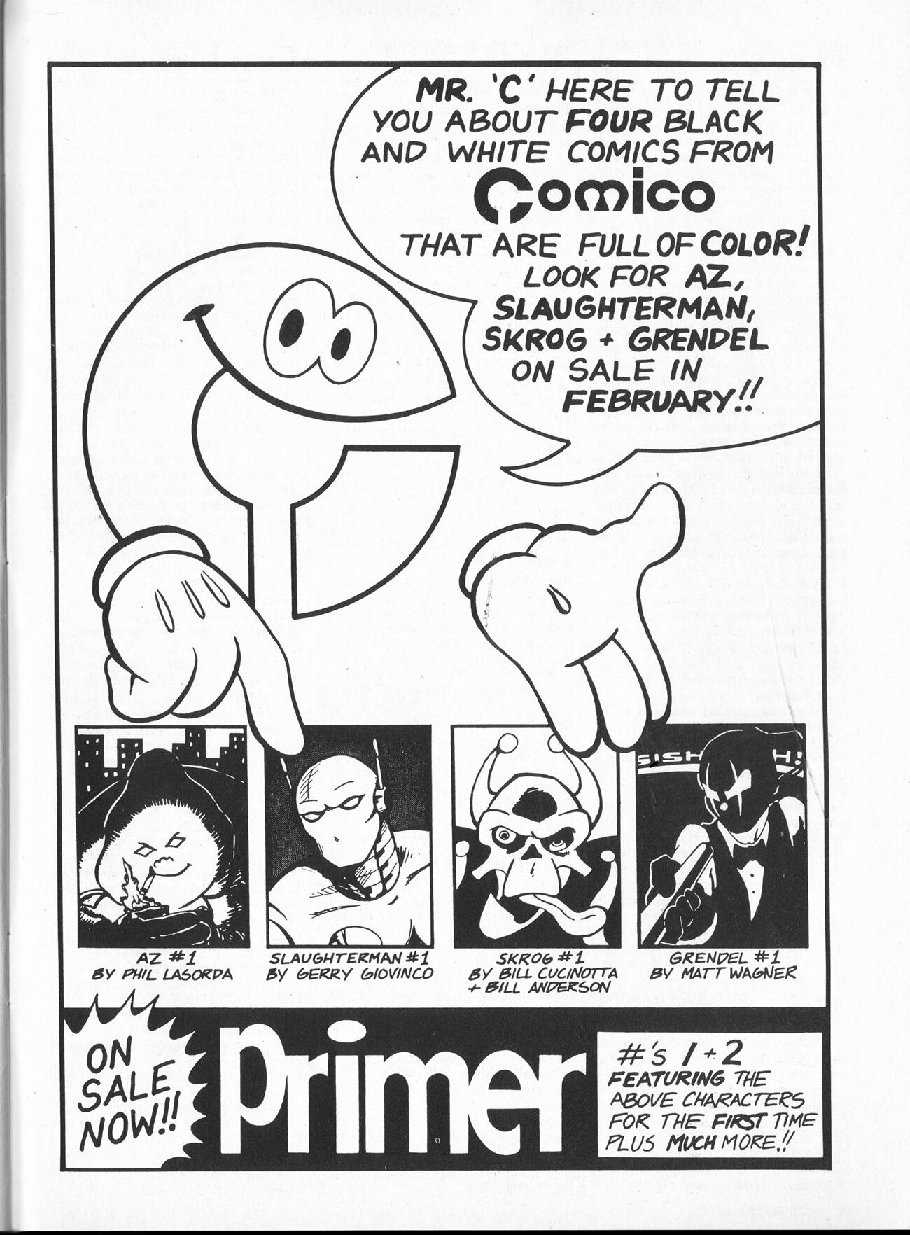 1983 was our first year attending with a booth and we were quick to realize how easy it was to get lost in the vast auditorium of vendors, publishers and artists. Comico was a small black-and-white publisher at the time featuring five titles: Az by Phil LaSorda, Grendel by Matt Wagner, Slaughterman by myself, Skrog by Bill Cucinotta and our new-talent anthology, Comico Primer. We had our sites set on publishing color books and had begun to promote our intentions.