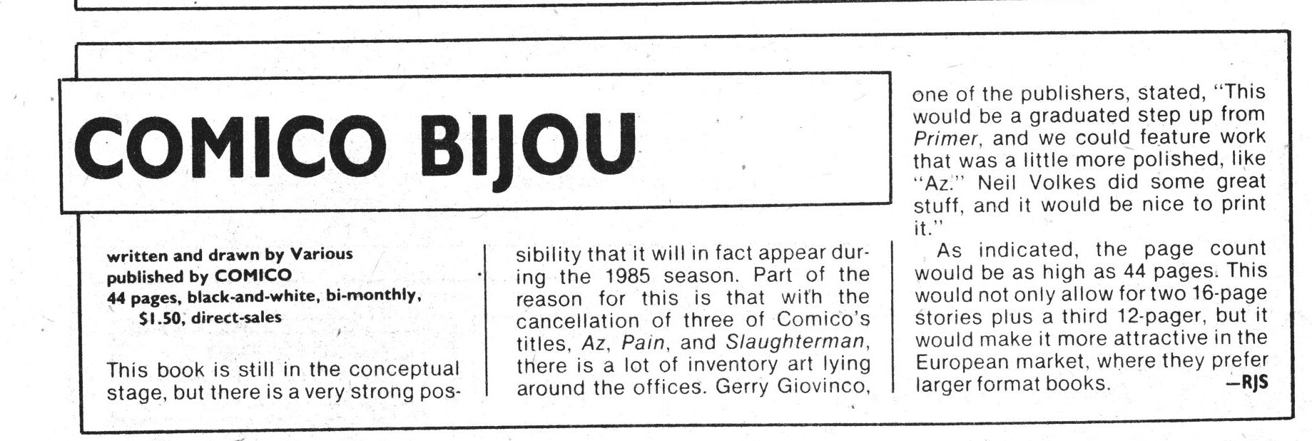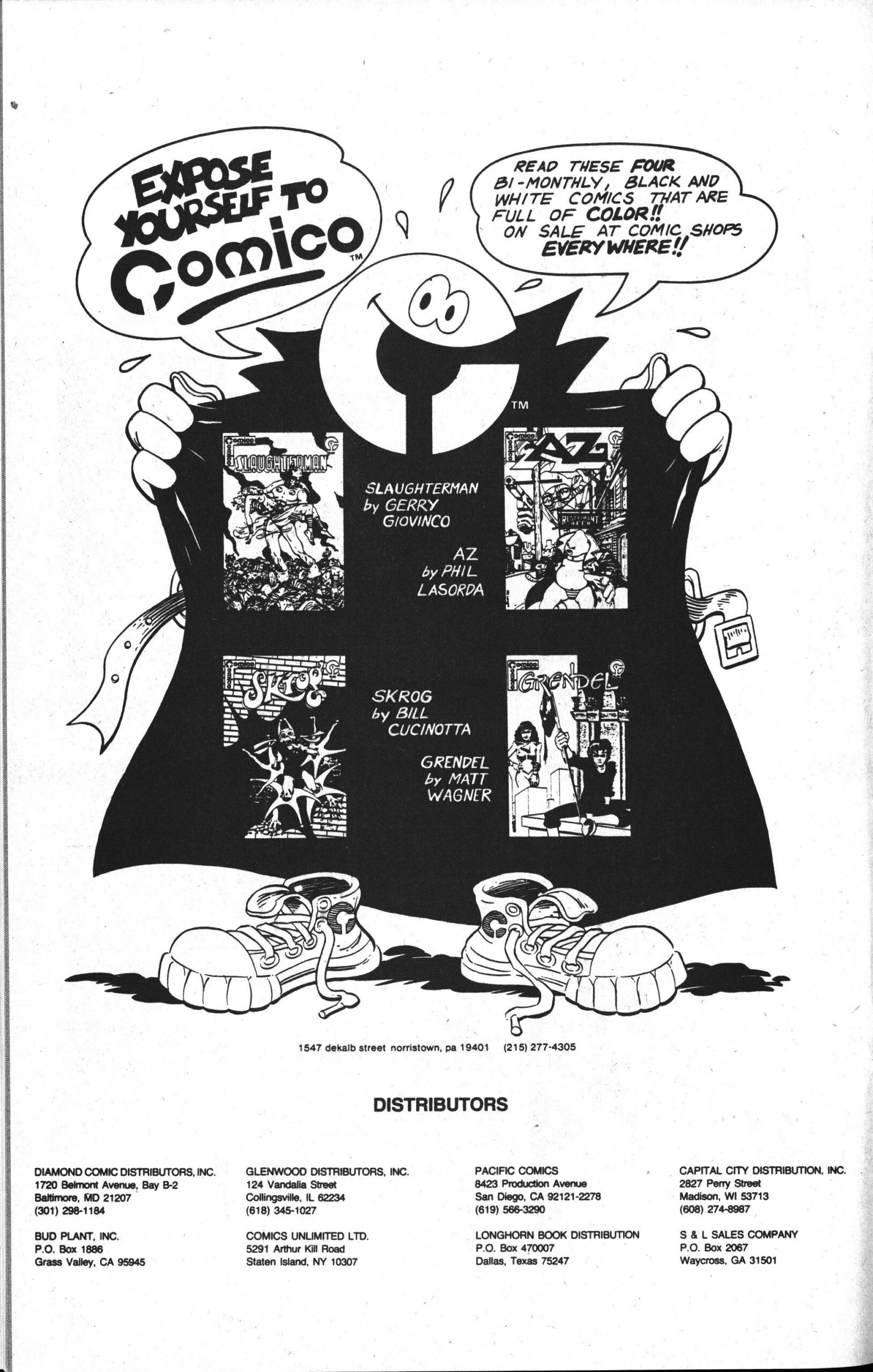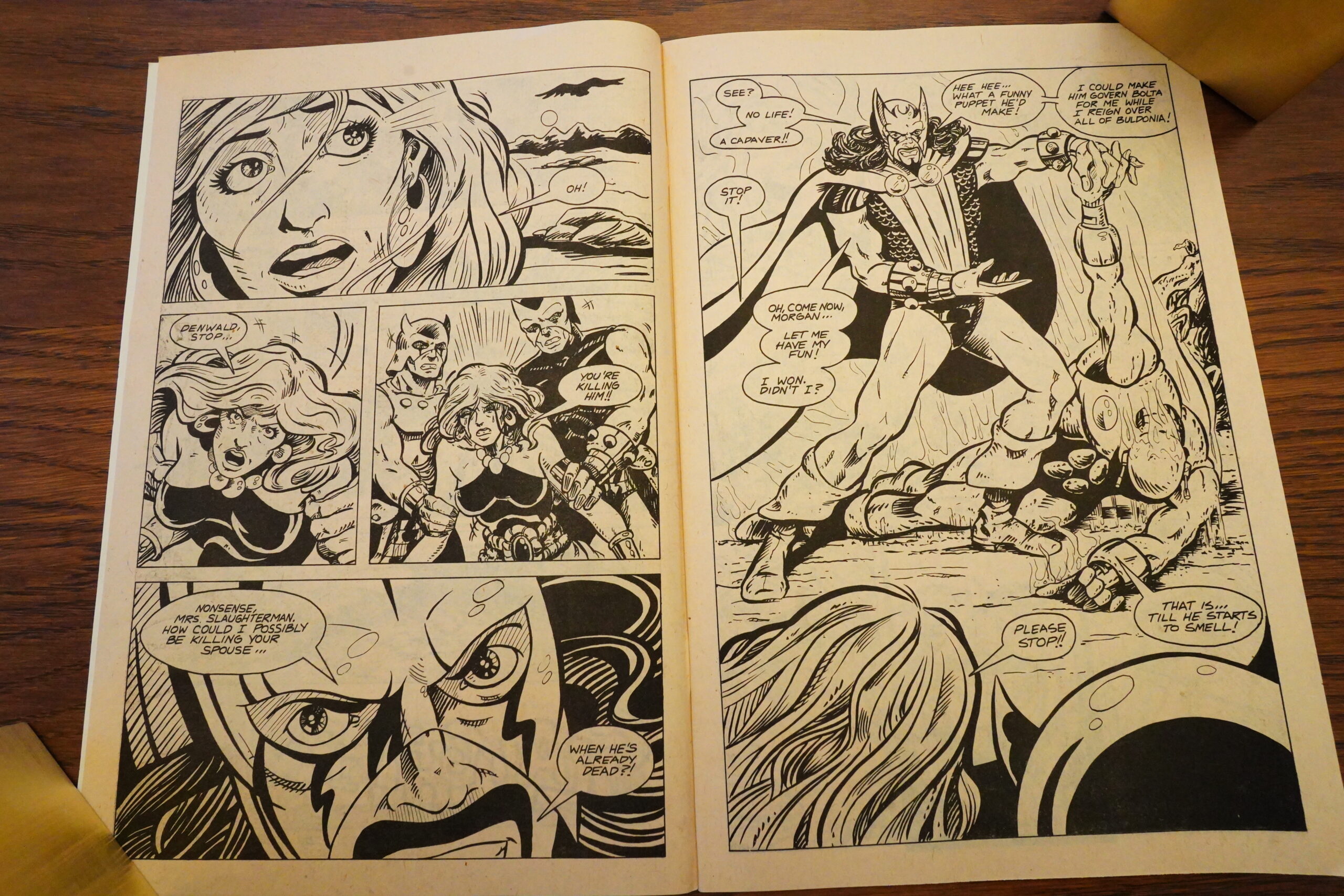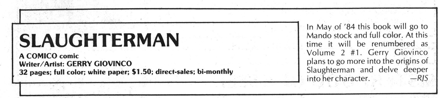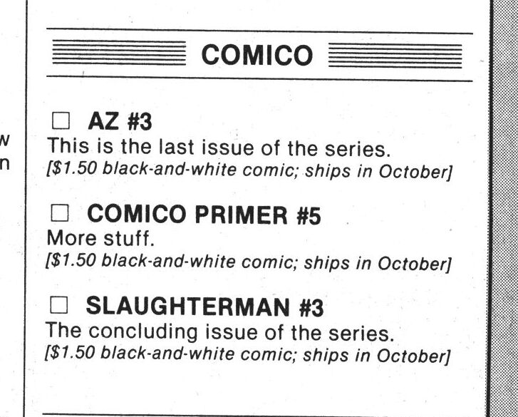 Amazing Heroes previews — this didn’t happen. When Comico switched to publishing colour comics, they planned on transitioning all their comics — Slaughterman, Az, Skrog — to colour. Instead they just cancelled them all.