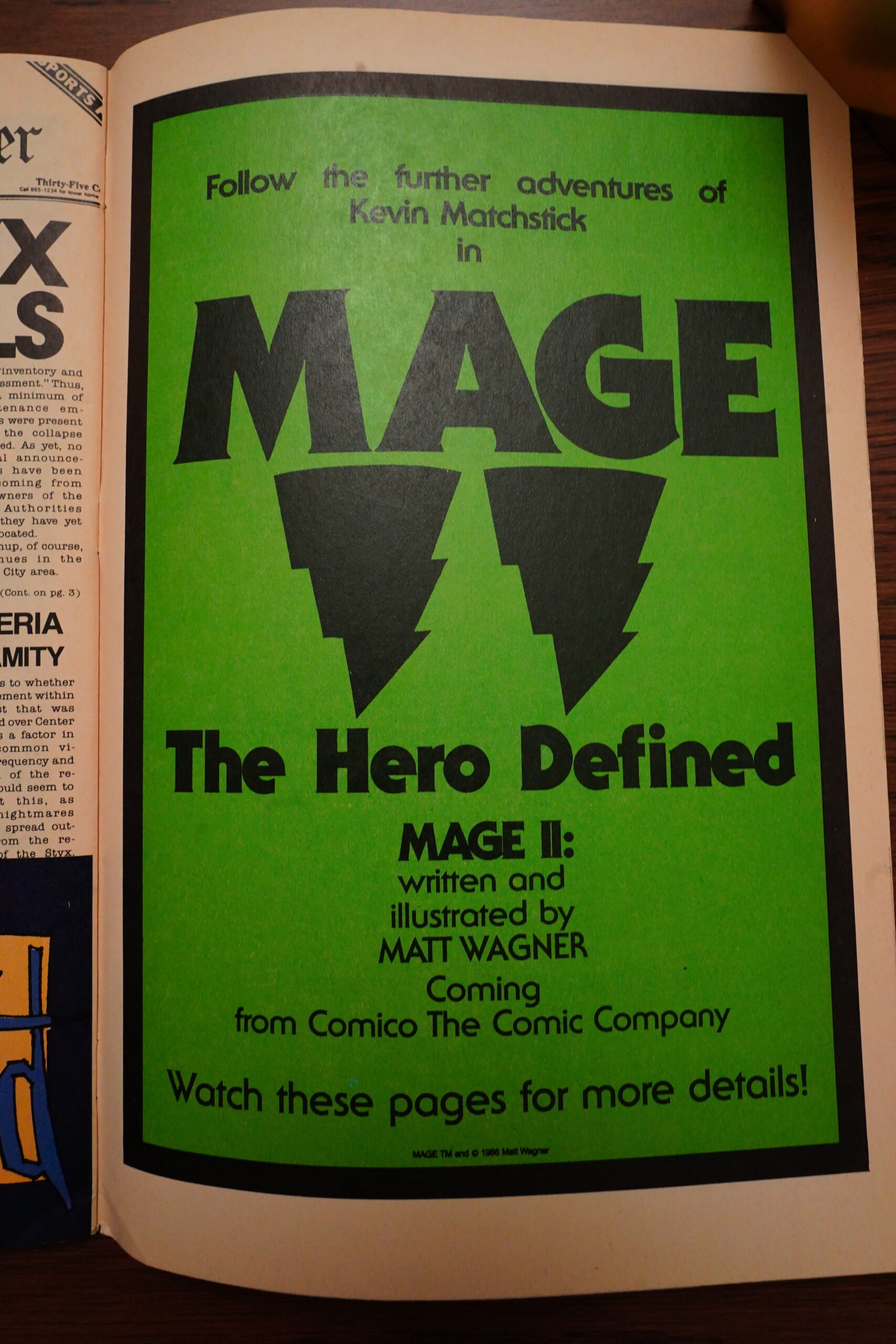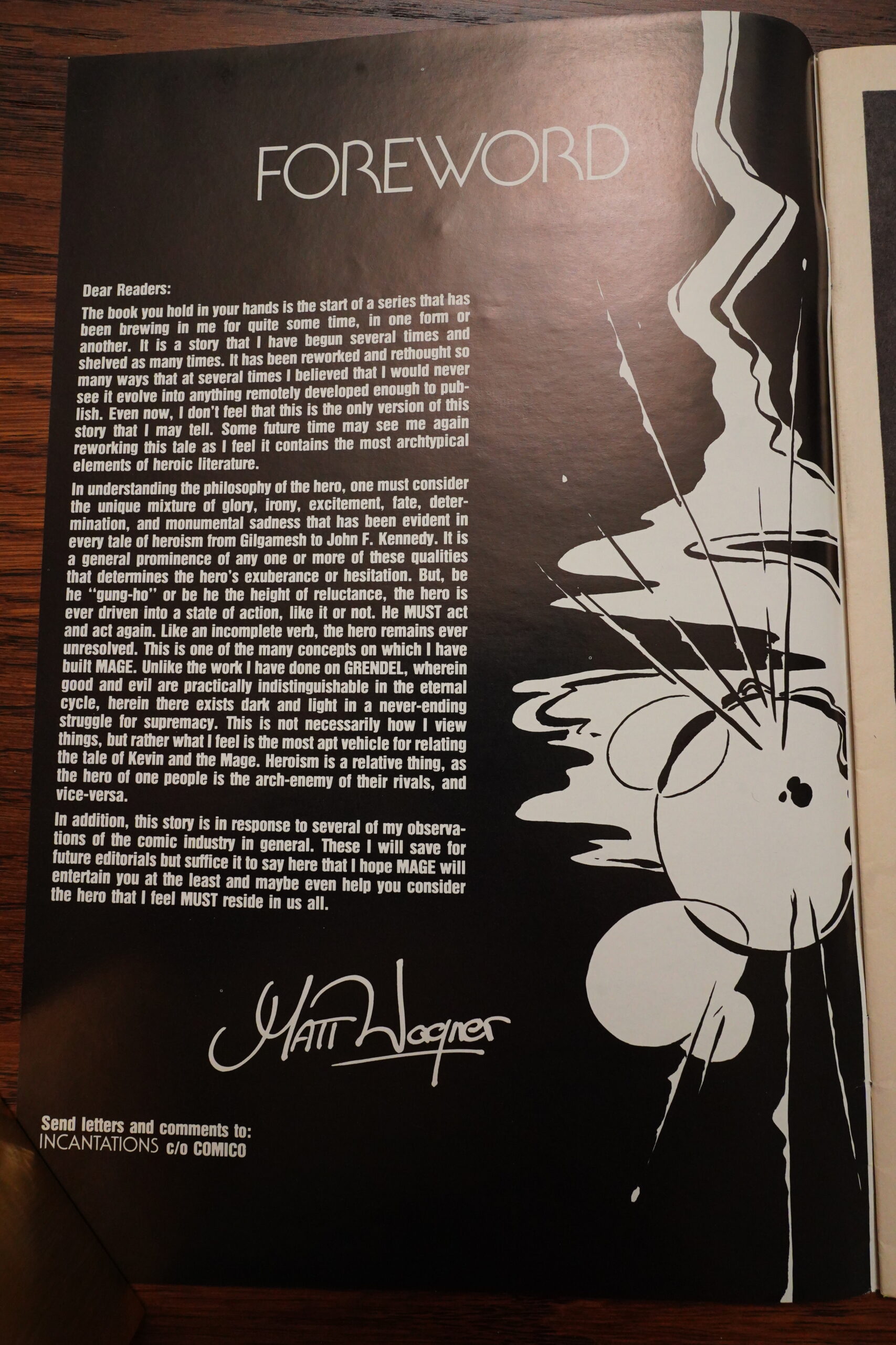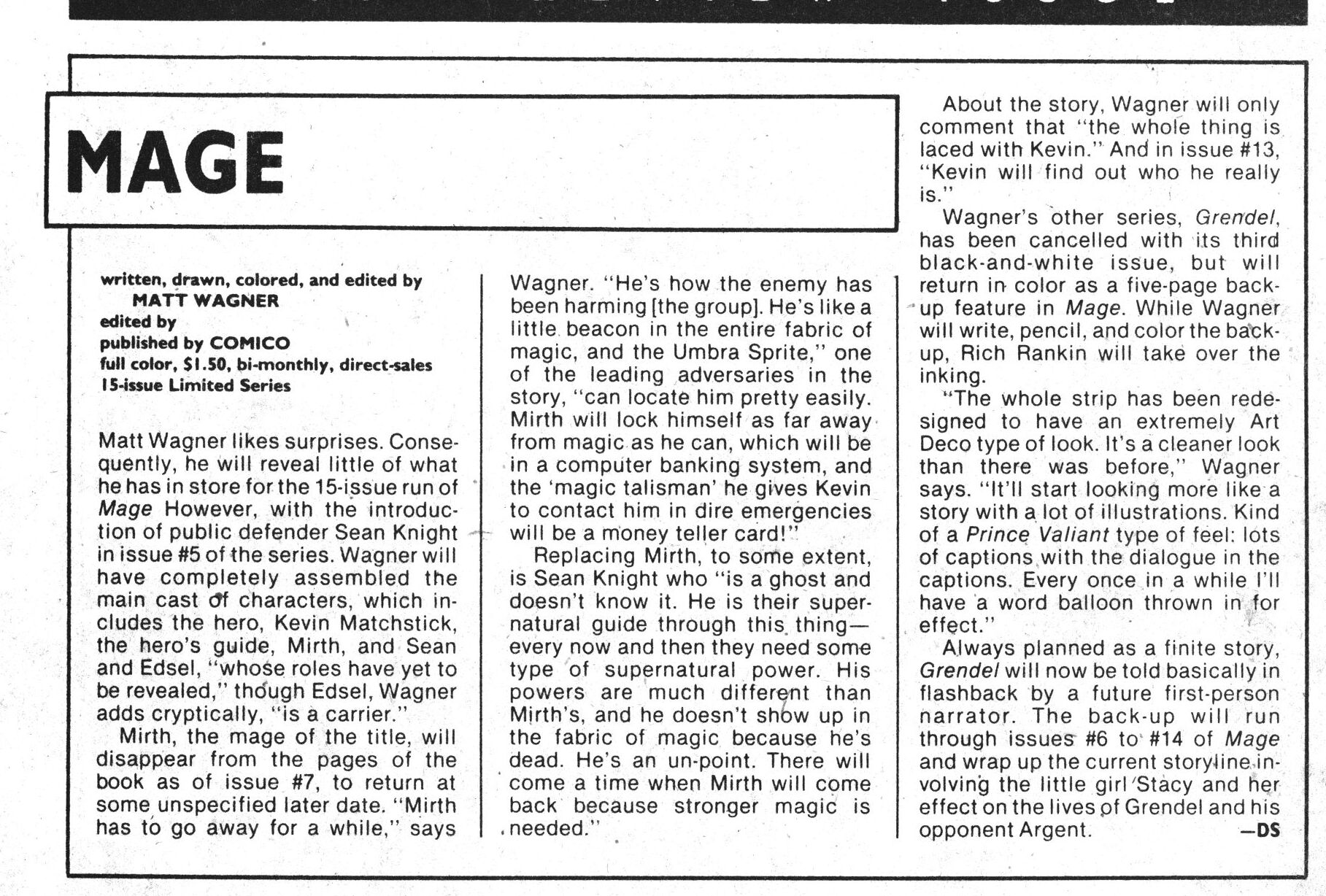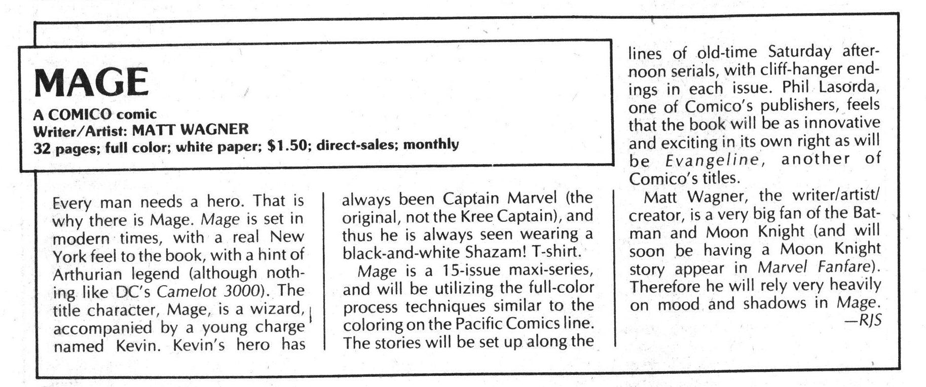 So Mage spun out of Wagner being into Arthurian stuff, but then Camelot 3000 came out, so he had to drop his original project. And then the Comico guys needed, quickly, a new colour comic book to print to not lose money, and viola: Mage!
