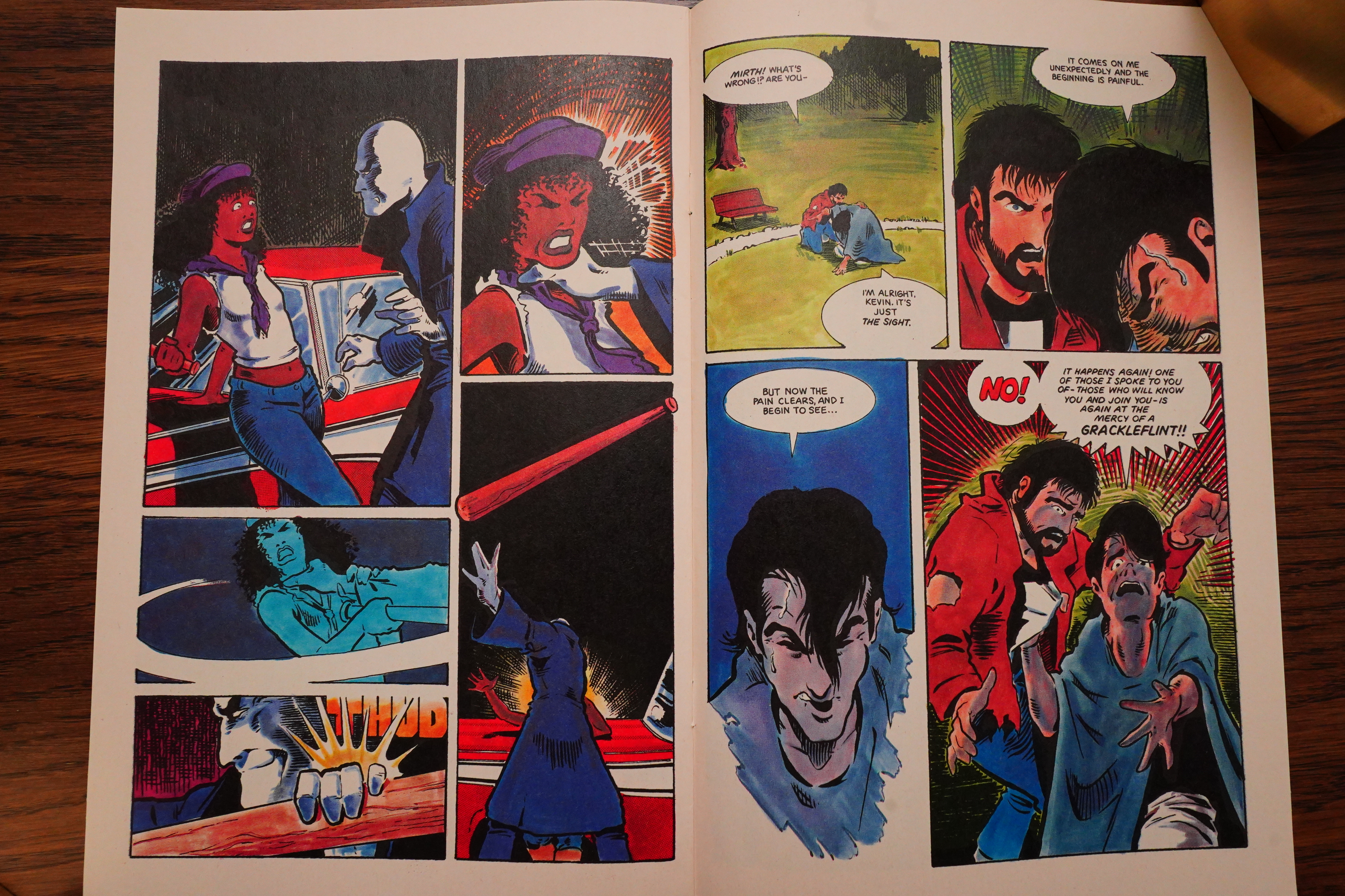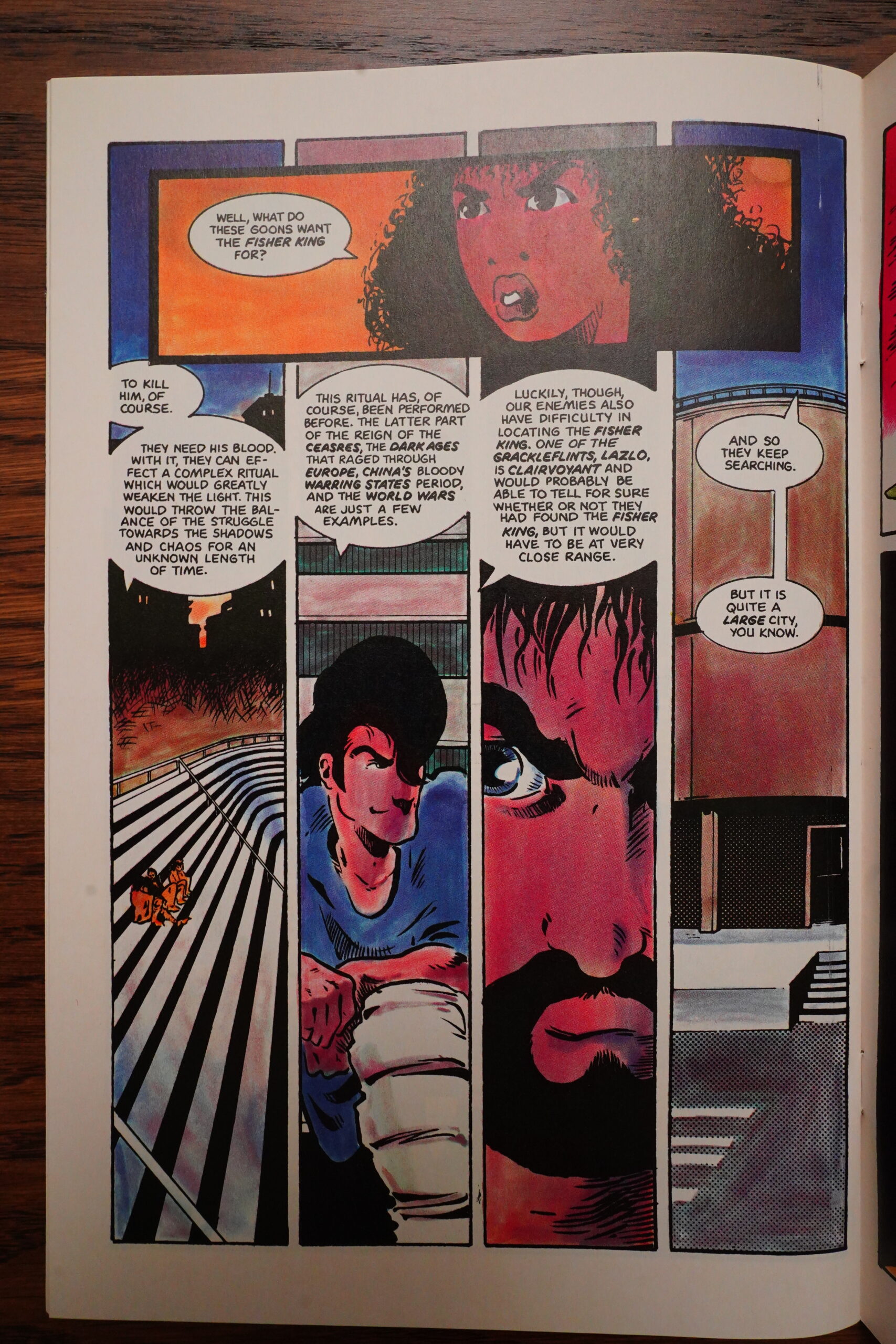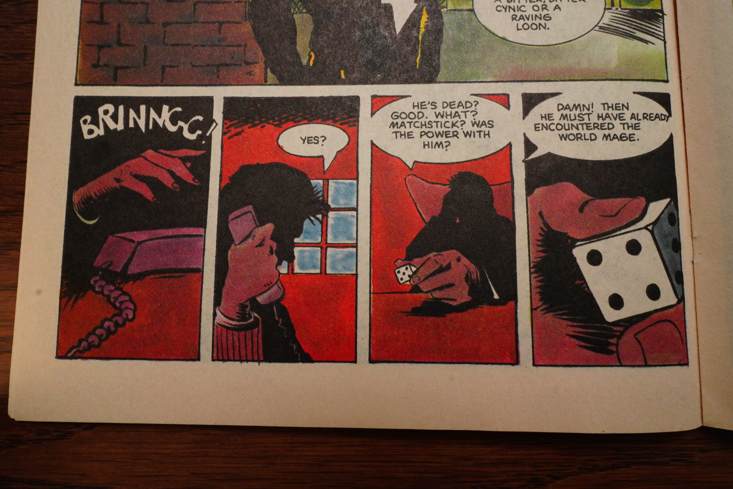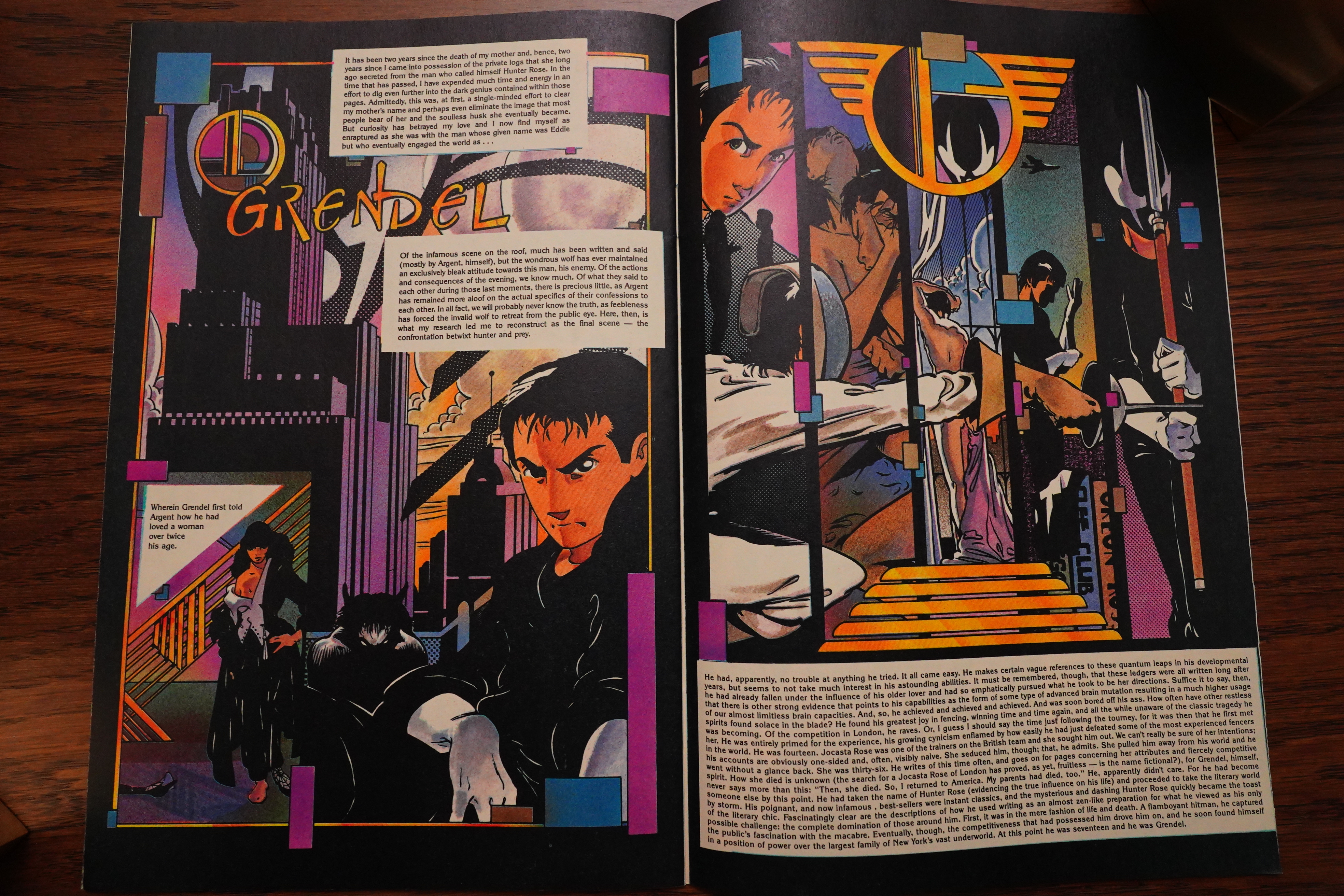 There was a long fight sequence in Grendel that had a dialogue scene going on over the right-hand pages, and then a fight scene on the left-hand pages, and that worked very well, I thought. Apparently Wagner thought so to, because he repeats the format in Mage.