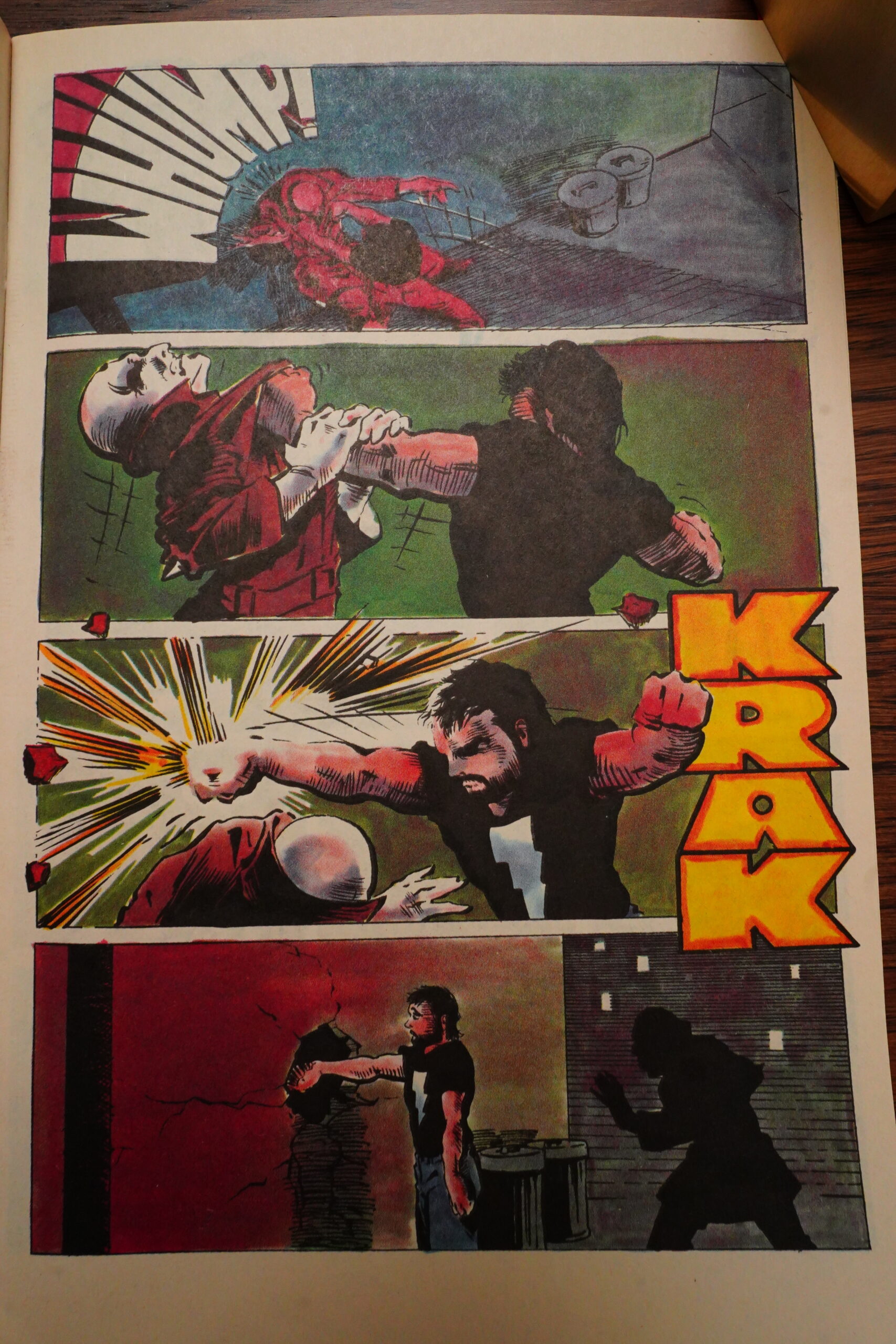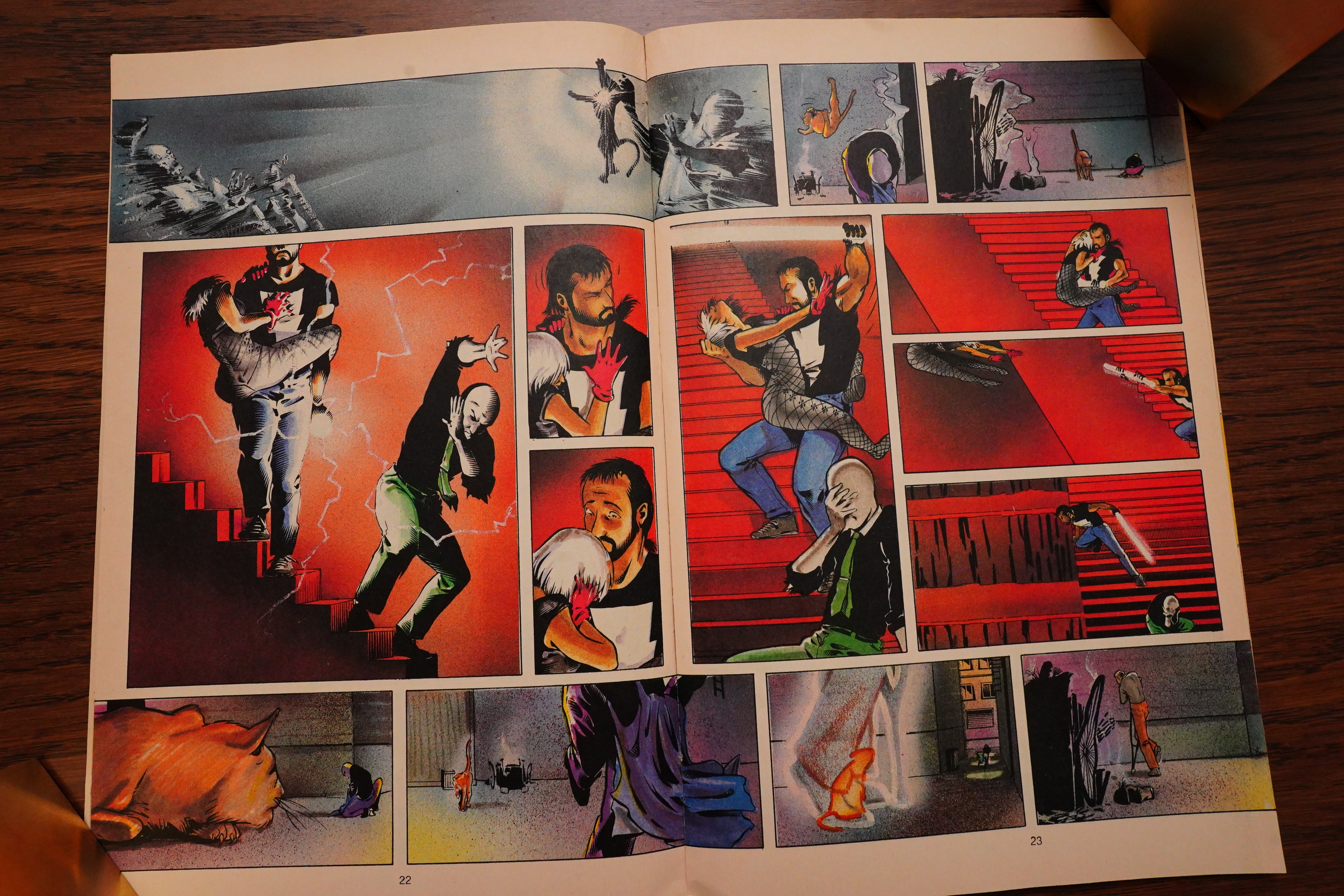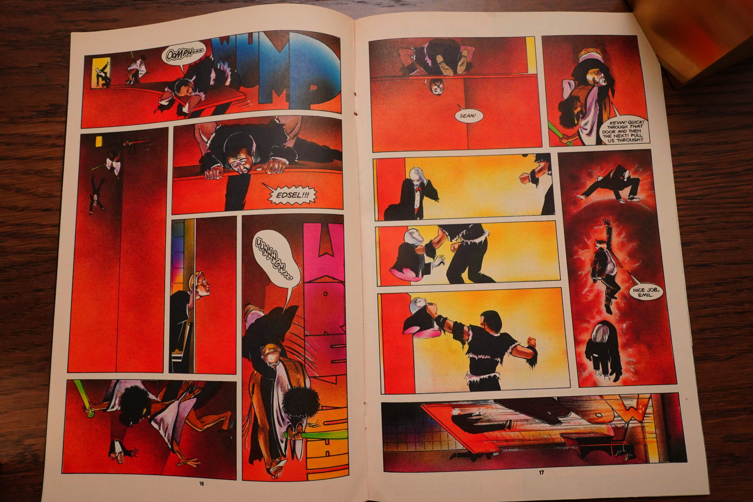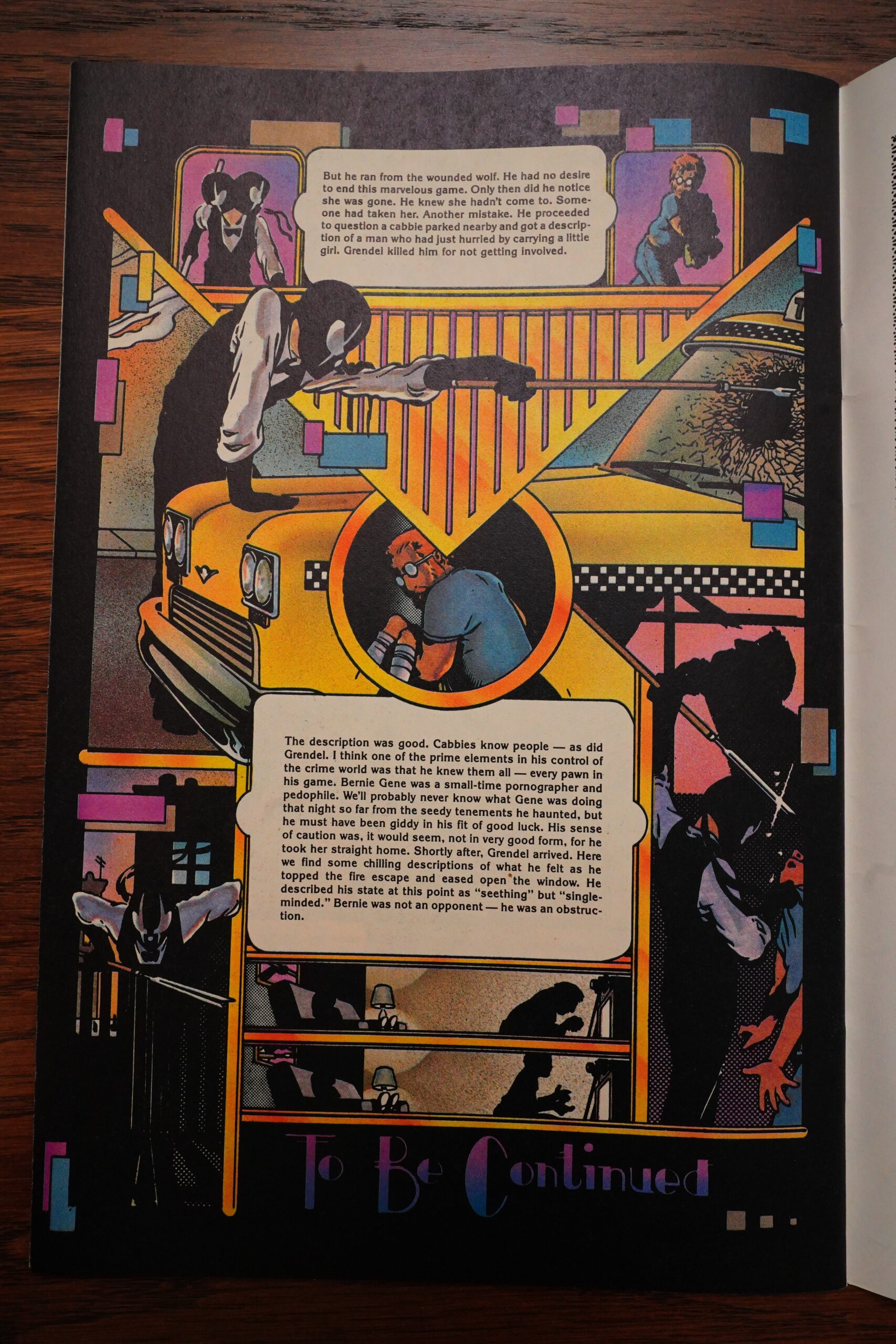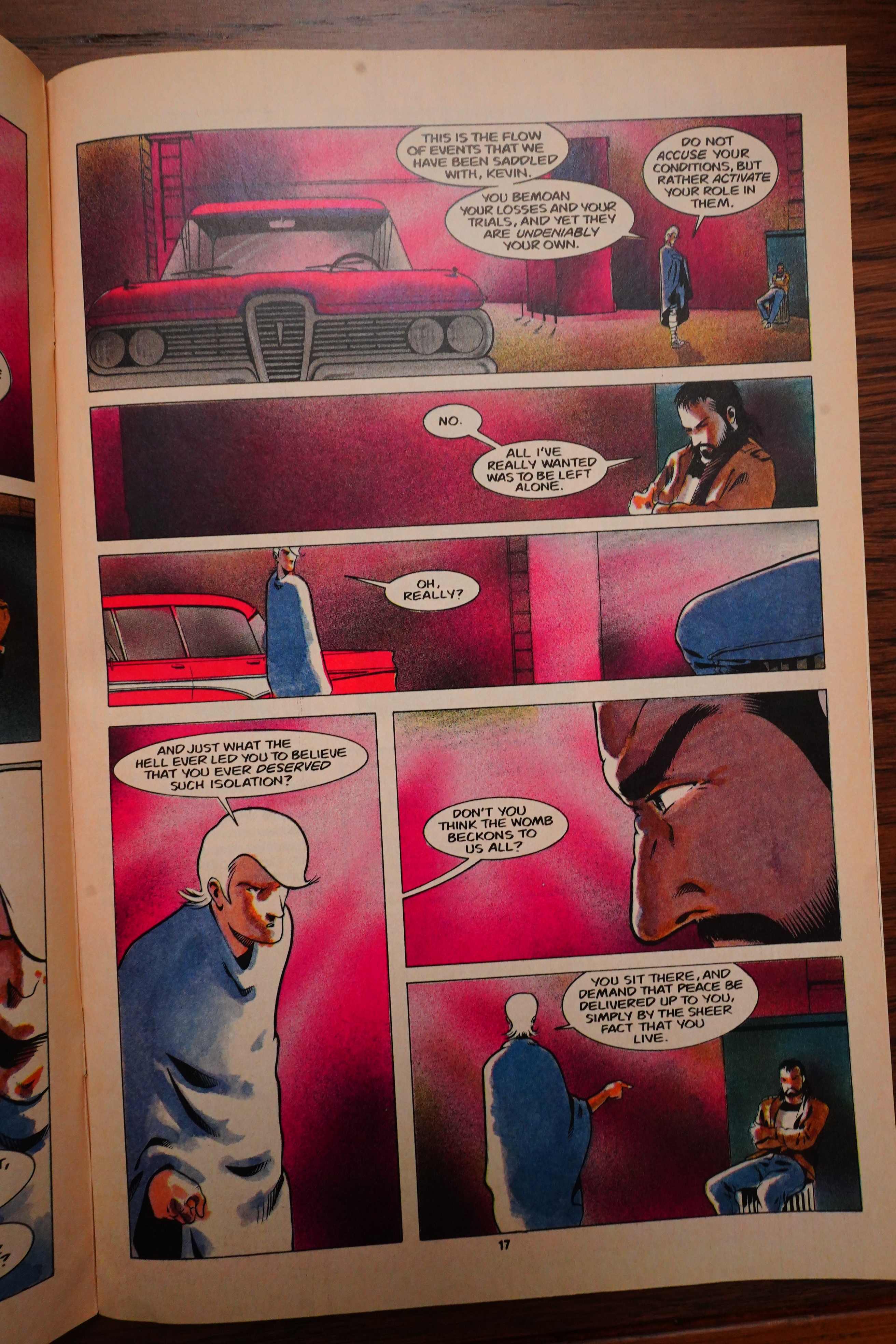 There was a long fight sequence in Grendel that had a dialogue scene going on over the right-hand pages, and then a fight scene on the left-hand pages, and that worked very well, I thought. Apparently Wagner thought so to, because he repeats the format in Mage.