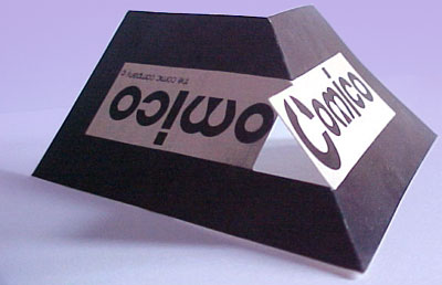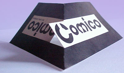 The card I designed was also hinged, die cut and folded so the Comico logo would read on both sides. When it opened our information was displayed inside. It was black and white, innovative and elegant, just the impression we wanted to create for our line.