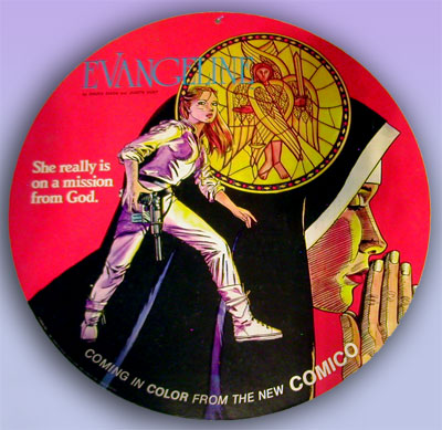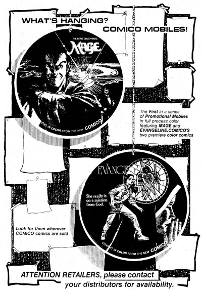The Comico Mobile, which was promoted as “The First in a series of Promotional Mobiles,” was a simple elegant design though it would be the first and only one of the intended series. It was a cardboard disc that was 18 inches in diameter printed in full color on both sides, Mage on one side, Evangeline on the other. At the top was drilled a tiny hole from which it could be hung.