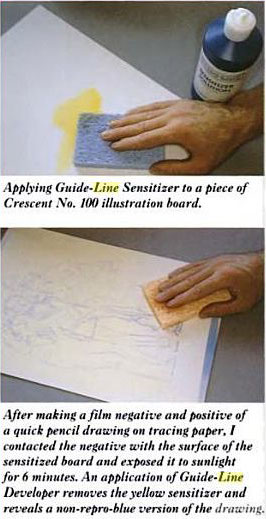 This system was very similar to the gray-line system in that you had to produce a positive transparency of the line art. The grey line required a negative to produce the grey guide-line on the layer to be painted. The Fluorographics system let you use the film positive to create the non-repo blue guide which eliminated an extra step and expense. You could coat any paper stock you wanted with the chemicals allowing you to paint much more naturally than on the polymer based photo paper of the gray-line.