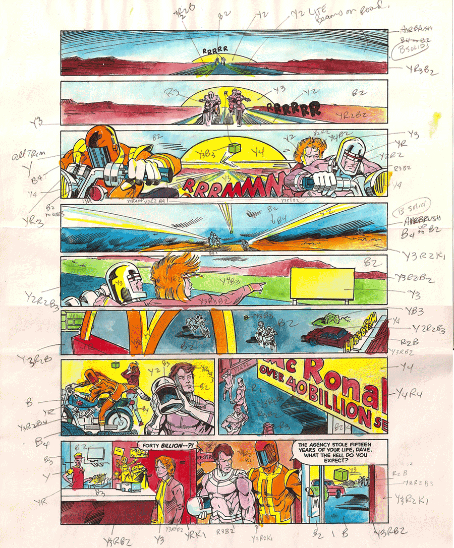 At Murphy Anderson’s Visual Concepts, Murphy Jr. would apply an airbrushed fill to the films to match the specs of the gradient. Murphy was a master at this and made many a Comico product look fabulous.