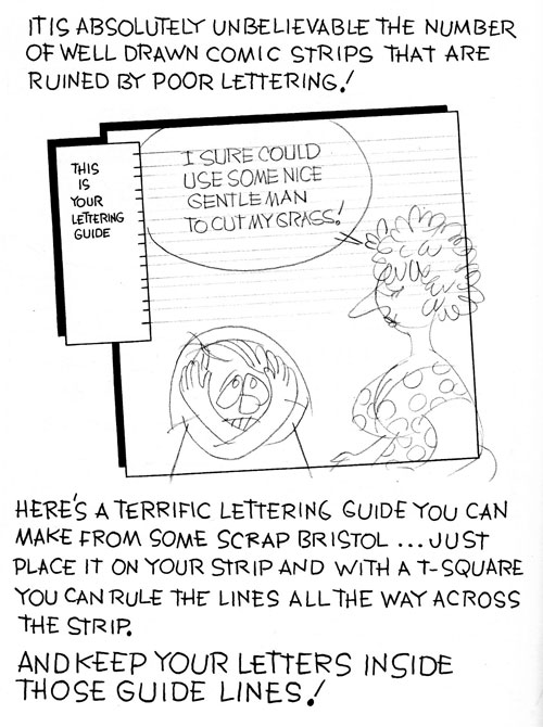 Chris Kalnick, my pal, former ROBOTECH inker and creator of NON and DEPTH CHARGE both featured here at CO2 Comics recently sent me this video of the Ames Lettering Guide being demonstrated. A comic letterer will rule guide lines wherever lettering is expected on the comic page. The lines are drawn very lightly as they are merely guides and will be eventually erased. Some letterers prefer to rule these lines with a non-repro blue pencil. After the lines are drawn the letters are penciled or roughed in. The final lettering will then be done in india ink.