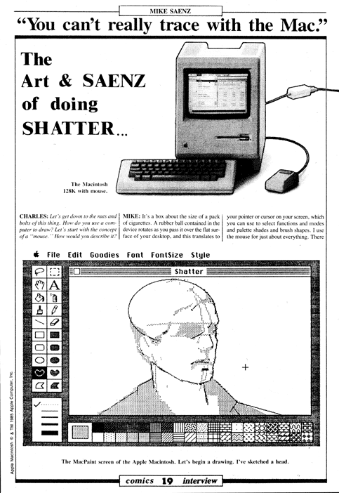 In 1985 First Comics published Shatter by Peter B. Gillis and Mike Saenz. This was the first all-digital comic commercially published. It was created on a Mac exactly like the one that sat in our office at Comico.