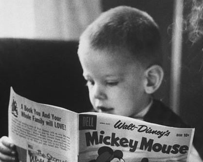 The photo of a man-child smoking a cigarette at the ripe-old-age of four and reading a Mickey Mouse comic book conjured thoughts of poster children for Dr. Fredrick Wertham’s Seduction of the Innocent. A chuckle or two later I was envisioning future Marvel and DC editors ensuring that the medium would grow and mature with their personal tastes leaving behind the more innocent subject matter that they enjoyed as children along with the audience it catered to.