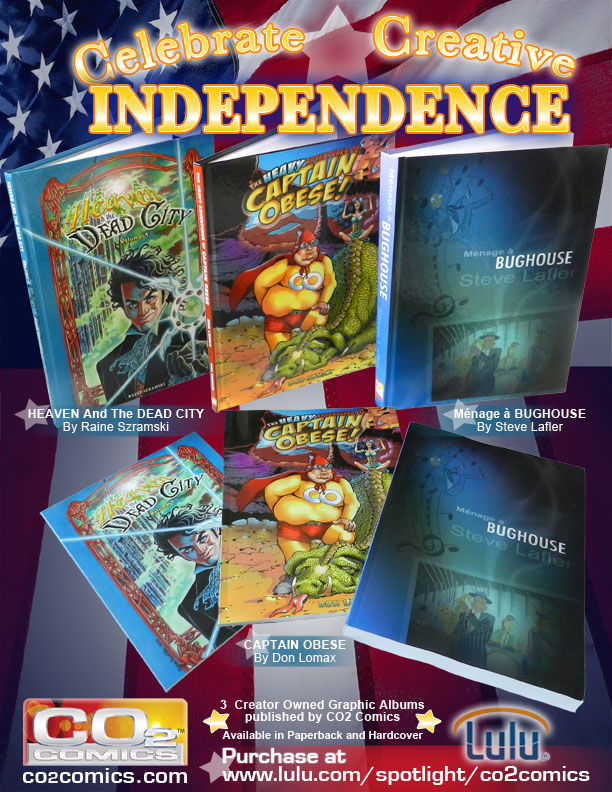 Most importantly we produce comic books in print with more freedom than we ever would have thought possible thirty years ago when we first began publishing. Last year we celebrated as Independents by declaring The Power of Three. by releasing our first three graphic novels under the CO2 Comics imprint, Heaven and the Dead City, The Heavy Adventures of Captain Obese! and Ménage à Bughouse.