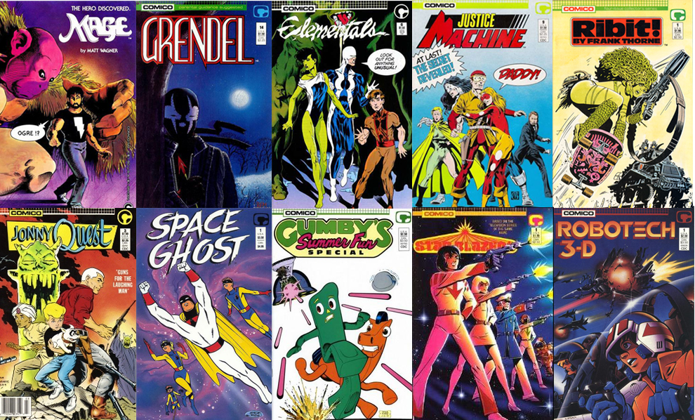 Comico Mage, Grendel, Elemental, Justice Machine, Ribit, Jonny Quest, Space Ghost, Gumby, Star Blazers, Robotech