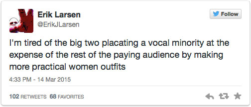 Regarding, Erik Larsen, well, he just had a meltdown. He lambasted the big two on twitter for “placating a vocal minority at the expense of the paying audience by making more practical women outfits.”